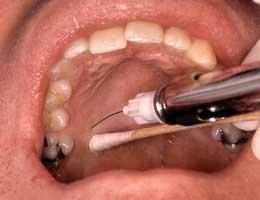 Первым этапом обезболивания является аппликационная анестезия – смазка десны обезболивающим гелем или опрыскивание спреем лидокаина. Такую анестезию применяют при несложных стоматологических процедурах (например, удаление зубного камня). Если же требуется более глобальное вмешательство (удаление нерва), то необходим второй этап – инфильтрационная анестезия (укол в десну обезболивающего препарата).
